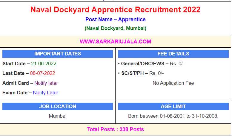Post Description –Naval Dockyard, Mumbai is inviting online applications for Apprentice for 338 posts. Interested people meet all the eligibility criteria, apply online Details Of Recruitment Of Naval Dockyard Apprentice Online Form 2022Posts Name – Apprentice Number Of Posts – 338 Posts Category Wise Posts – One Years Training Electrician – 49 Posts Electroplater – 01 Posts Marine Engine Fitter – 36 Posts Foundry ma – 02 Posts Pattern Maker – 02 Posts Mechanic Diesel– 39 Posts Instrument Mechanic – 08 Posts Machinist – 15 Posts Mechanic Machine Tool Maintenance – 15 Posts Painter(Gen) – 11 Posts Sheet Metal Worker – 03 Posts Pipe Fitter – 22 Posts Mechanic Ref & AC – 08 Posts Tailor(General) – 04 Posts Welder (Gas and Electric) – 23 Posts Electronics Mechanic – 28 Posts Shipwright wood – 21 Posts Fitter – 05 Posts Mason Building Constructor – 08 Posts I&CTSM – 03 Posts Two Years Training Shipwright stee – 20 Posts Rigger – 14 Posts Forger and Heat Treater – 01 Posts Stipend– Rs 7000/- Per month for ITI passed & Rs 6000/- for Education Qualification – Rigger (Fresher) – 08th Passed REST All Posts – ITI Passed In Related Trade with 65% Marks Physical Standard Height: 150 cm Weight : 45 KG How to Apply Online Naval Dockyard Apprentice Online Form 2022 – Candidates can apply through link provided below or they can also apply through official site of the MP Online Services Selection Board before 08/July/2022. Required Documents For Online Application – Educational Mark sheet And Certificates Aadhar Card / Pan Card Passport Size Photo Signature Selection Mode – Written Examination Final Merit List