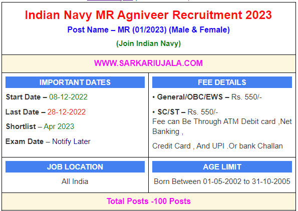 Post Description – Join Indian Navy is inviting online applications for 100 Posts For Agniveer MR posts. Interested people meet all the eligibility criteria, apply online Details Of Recruitment Of Indian Navy Agniveer MR Online Form 2023Posts Name – Agniveer MR (Male & Female) Number Of Posts – 100 Posts Pay Scale – 1st Years – ₹ 30,000/- Per Month 2nd Years – ₹ 33,000/- Per Month 3rd Years – ₹ 36,500/- Per Month 4th Years – ₹ 40,000/- Per Month Categories Wise Posts – Male- 80 Posts Female- 20 Posts Education Qualification – 10th Passed From Any Recognized Board Physical Standard Height & Chest Height: 157 cm (Male) , 152 cm (Female) Running- 1600 Meter in 6 Minute 30 Second (Male), 1600 Meter in 8 Minute (Female), Uthak Baithak – 20 Push Ups – 12 How to Apply Online Indian Navy Agniveer MR Online Form 2023 – Candidates can apply through link provided below or they can also apply through official site of the Join Indian Navy before 17/December/2022. Required Documents For Online Application – 10th Mark sheet And Certificates Aadhar Card / Pan Card Passport Size Photo Signature Selection Mode – Shortlist CBT Exam PET/PST Final Merit List