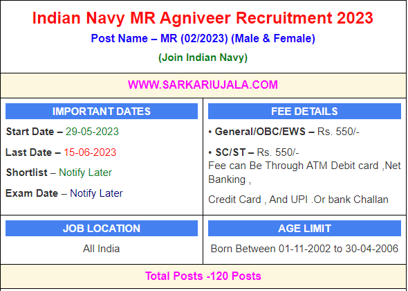 Indian Navy MR Agniveer Recruitment 2023Post Name – MR (02/2023 & 01/2024) (Male & Female)(Join Indian Navy) | |||||