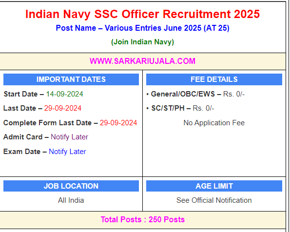 Post Description – Join Indian Navy is inviting online applications for Various Entries Jun 2025 for 250 posts. Interested people meet all the eligibility criteria, apply online Details Of Recruitment Of Indian Navy SSC Officer June 2025 Online FormPosts Name – Various Entries Jun 2025 (AT 25) Number Of Posts – 250 Posts Category Wise Posts – Executive Branch – 157 Posts General Service [GS(X)] – 56 Posts Air Traffic Control ATC – 20 Posts Naval Air Operations Officer NAOO – 21 Posts Pilot – 24 Posts Logistics – 20 Posts Naval Armament Inspectorate Cadre (NAIC)- 16 Posts Education Branch – 15 Posts Education- 15 Posts Technical Branch – 78 Posts General Service GS Engineering Branch- 36 Posts General Service GS Electrical Branch- 42 Posts Pay Scale – As Per Rules Education Qualification – Executive Branch-: All Posts – BE / B. Tech in Any Stream with 60% Marks Education Branch-: Maths /Operational Research-M.Sc. (Maths /Operational Research) with 60% Marks & Physics in B.Sc. Physics/Applied Physics – M.Sc. (Physics/Applied Physics) with 60% Marks & Maths in B.Sc. History – MA (History) With 55% Marks Electronics & Communication- BE / B.Tech with minimum 60% marks (Electronics & Communication/ Electrical & Electronics/ Electronics & Instrumentation/ Electronics & Telecommunications/ Electrical) Mechanical – BE / B.Tech with minimum 60% marks in Mechanical Engineering Computer Science/Information– BE/B. Tech with minimum 60% marks (Computer Science/Information Technology/Information Systems Technical Branch-: General Service GS Engineering Branch- BE / B.Tech Degree with 60% Marks in Aeronautical (ii) Aero Space (iii) Automobiles (iv) Control Engg (v) Industrial Engineering & Management (vi) Instrumentation (vii) Instrumentation & Control (viii) Mechanical/Mechanical with Automation (ix) Marine (x) Mechatronics (xi) Metallurgy(xii) Production. General Service GS Electrical Branch- BE / B.Tech Degree with 60% Marks in Electrical (ii) Electronics (iii) Electrical & Electronics (iv) Electronics & Communication (v) Applied Electronics and Communication (AEC) (vi) Electronics & Tele Communication (vii) Tele Communication (viii) Instrumentation (ix) Electronics & Instrumentation (x) Applied Electronics & Instrumentation (xi) Instrumentation & Control (xii) Power Engineering (xiii) Power Electronics. Naval Architect (NA)- BE / B.Tech Degree with 60% Marks in Aeronautical (ii) Aero Space (iii) ) Civil (iv) Mechanical/ Mechanical with Automation(v) Marine Engineering (vi) Metallurgy (vii) Naval Architecture (viii) Ocean Engineering (ix) Ship Technology (x) Ship Building (xi) Ship Design How to Apply Online Indian Navy SSC Officer June 2025 Online Form – Candidates can apply through link provided below or they can also apply through official site of the Join Indian Navy before 29/September/2024. Required Documents For Online Application – Educational Mark sheet And Certificates Aadhar Card / Pan Card Passport Size Photo Signature Selection Mode – Written Exam Interview Final Merit List