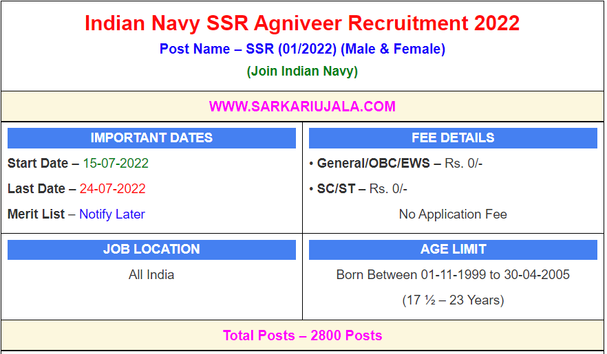 Indian Navy SSR Agniveer Recruitment 2022Post Name – SSR (01/2022) (Male & Female)(Join Indian Navy) | |||||