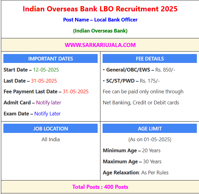 Post Description – IOB Indian Overseas Bank Is Inviting Online Application Form For Local Bank Officer Posts For 400 Posts. Eligible Candidates Can Apply Online Form. Details Of Recruitment Of Indian Overseas Bank LBO Online Form 2025 Posts Name – Local Bank Officer Number Of Posts – 400 Posts Category Wise Posts – Tamil Nadu– 260 Posts Odisha – 10 Posts Maharashtra – 45 Posts Gujarat – 30 Posts West Bengal – 34 Posts Punjab – 21 Posts Pay Scale – As Per Rules Education Qualification – Graduate Degree From Any Board And Knowledge of Local Language . How to Apply Online Indian Overseas Bank LBO Online Form 2025 – Candidates can apply through link provided below or they can also apply through official site of the Indian Overseas Bank before 31/May/2025. Required Documents For Online Application – Educational Mark sheet And Certificates Aadhar Card / Pan Card Passport Size Photo Signature Selection Mode – CBT Exam Language Proficiency Test (LPT) Interview Document Verification Merit List | |||||