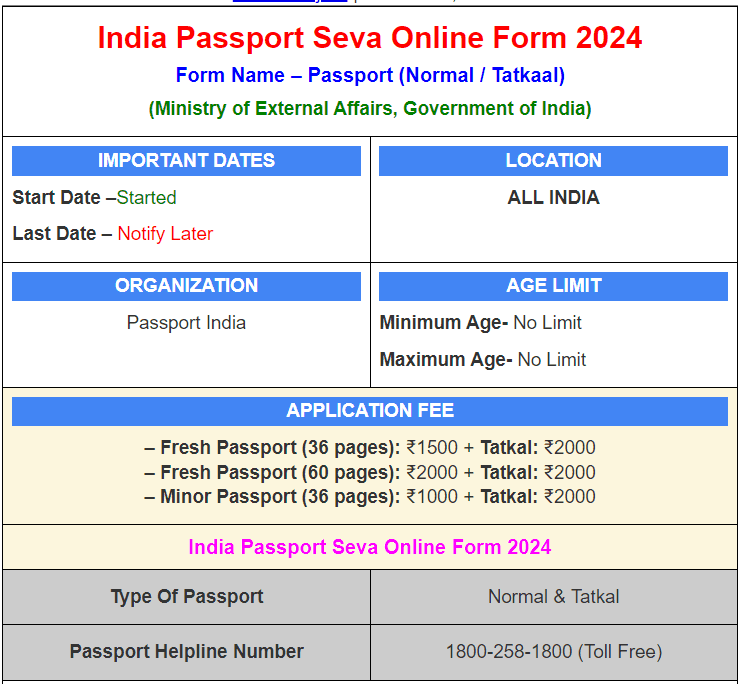 India Passport Seva Online Form 2024Form Name – Passport (Normal / Tatkaal)(Ministry of External Affairs, Government of India) | |||||