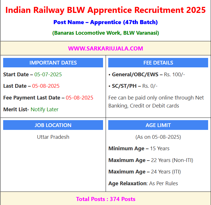 Post Description – BLW Banaras Locomotive Work, BLW Varanasi is inviting online applications for Apprentice for 374 posts. Interested people meet all the eligibility criteria, apply online Details Of Recruitment Of Railway BLW Apprentice Online Form 2023Posts Name – Apprentice Number Of Posts – 374 Posts Trade Wise Posts – ITI Post – 300 Posts Fitter- 107 Posts Carpenter – 03 Posts Painter – 07 Posts Machinist – 67 Posts Welder (G & E) – 45 Posts Electrician – 71 Posts Non ITI Post – 74 Posts Fitter- 30 Posts Machinist – 15 Posts Welder (G & E) – 11 Posts Electrician – 18 Posts Stipend – As Per Rules Education Qualification – ITI Posts – 10th Passed with Minimum 50% Marks with ITI / NCVT Certificate in Related Trade. Non ITI Posts – 10th Passed With Minimum 50% Marks. How to Apply Online Railway BLW Apprentice Online Form 2025 – Candidates can apply through link provided below or they can also apply through official site of the Banaras Locomotive Work, BLW Varanasi before 07/August/2025 . Required Documents For Online Application – Educational Mark sheet And Certificates Aadhar Card / Pan Card Passport Size Photo Signature Selection Mode – Merit List | |||||