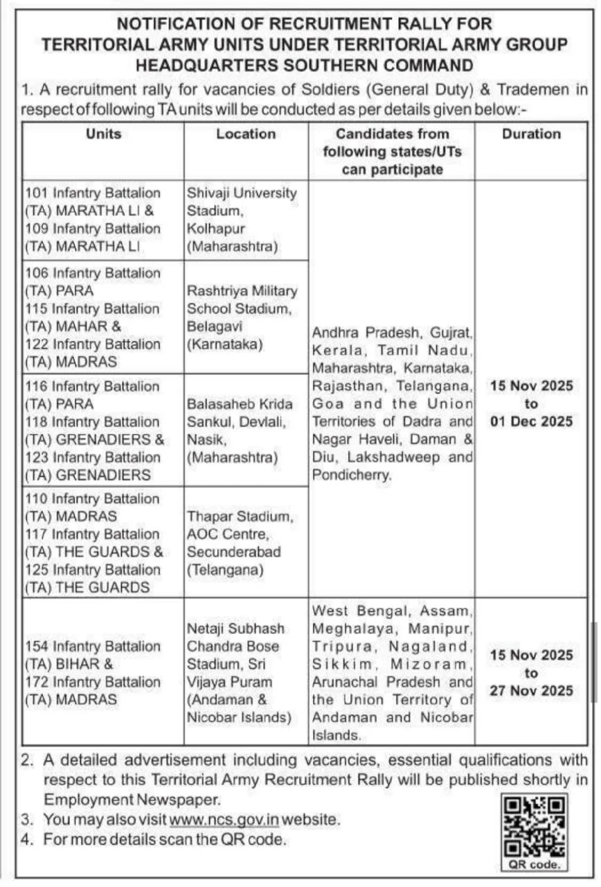 Indian Territorial Army Bharti Rally Recruitment 2025Post Name – Soldier , Clerk & Tradesman (Direct Rally)(Join Territorial Army) | |||||