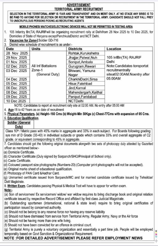 Post Description – Join Territorial Army is inviting online applications for Territorial Army posts. Interested people meet all the eligibility criteria, apply online Details Of Recruitment Of Territorial Army Bharti Rally Recruitment 2025Posts Name – Soldier , Clerk & Tradesman Number Of Posts – n/a Pay Scale –As Per Rules Education Qualification – Soldier (GD) – 10th Passed with 45% Marks From a Recognized board Soldier (Clerk)– 12th Passed with 60% Marks From A Recognized Board. Tradesman (10th Passed)- 10th Passed From A Recognized Board Tradesman (8th Passed) – 8th Passed From A Recognized School How to Attend Territorial Army Bharti Rally 2025 : 1. Candidates do not need to apply online. 2. To participate in the Territorial Army Bharti Rally 2025 3. candidates must directly visit the rally location on the scheduled date. 4 .Bring all required original documents (educational certificates, ID proof, domicile, etc.) and photocopies along with passport-size photographs. 5. Report to the rally site on time as per the date and venue mentioned in the official notification. Required Documents For Online Application – Educational Mark sheet And Certificates Aadhar Card / Pan Card Passport Size Photo Signature Selection Mode – PET/PST Document Verification Written Exam Merit List | |||||
