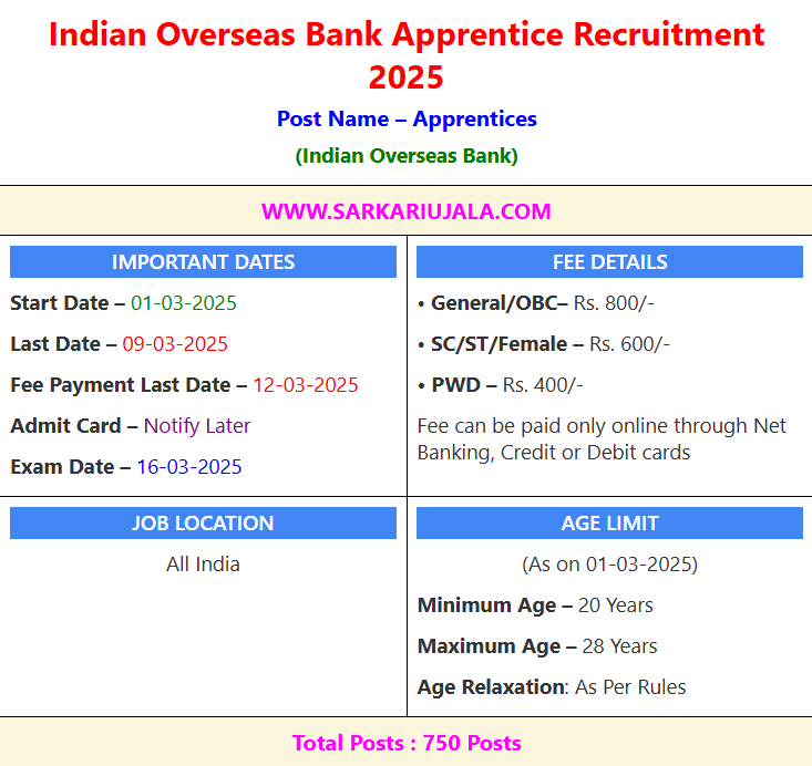 Indian Overseas Bank Apprentice Recruitment 2025Post Name – Apprentices(Indian Overseas Bank) | |||||