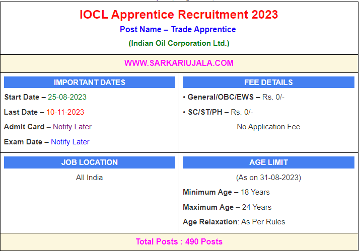 Post Description – IOCL Indian Oil Corporation Ltd. is inviting online applications for Apprentice for 490 posts. Interested people meet all the eligibility criteria, apply online Details Of Recruitment Of IOCL Trade Apprentice Online Form 2023Posts Name – Trade Apprentice Number Of Posts – 490 Posts Category Wise Posts – General – 226 Posts OBC – 128 Posts EWS – 49 Posts SC– 72 Posts ST– 15 Posts PwBD- 09 Posts Pay Scale – As Per Rules Education Qualification – Trade Apprentice – 10th Passed with regular full time 2 year ITI In Relevant Trade. Technician Apprentice – 3 years regular full time Diploma in Relevant Trade with minimum 50% marks in aggregate for General, EWS and OBC-NCL & 45% in case of SC/ST/PwBD . Graduate Apprentice/ Accounts Executive – Regular full time Graduate in any discipline with minimum 50% marks ( 45% Marks For SC/ST/PwBD) How to Apply Online IOCL Apprentice Online Form 2023 – Candidates can apply through link provided below or they can also apply through official site of the Indian Oil Corporation Ltd before 10/September/2023. Required Documents For Online Application – 10th /12th /ITI/Diploma Mark sheet And Certificates Aadhar Card / Pan Card Passport Size Photo Signature Selection Mode – CBT Examination Final Merit List