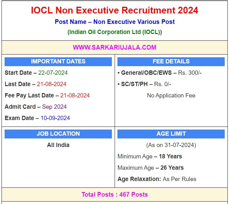 IOCL Non Executive Recruitment 2024Post Name – Non Executive Various Post(Indian Oil Corporation Ltd (IOCL)) | |||||