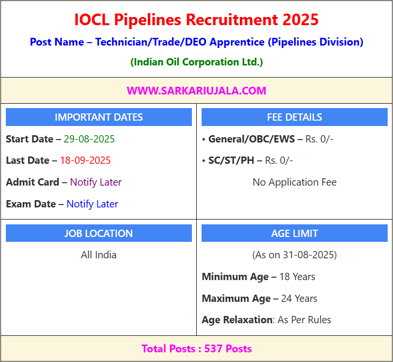 Post Description – IOCL Indian Oil Corporation Ltd. is inviting online applications for Trade Apprentice (Pipelines Division) for 537 posts. Interested people meet all the eligibility criteria, apply online Details Of Recruitment Of IOCL Pipeline Division Online Form 2025Posts Name – Trade Apprentice (Pipelines Division) Number Of Posts – 537 Posts Pay Scale – As Per Rules Education Qualification – Technician Apprentice (Mechanical)- 3-year full-time Diploma (or lateral entry after XII (Sc)/ITI) in Mechanical/Automobile Engg. Technician Apprentice (Electrical)- 3-year full-time Diploma (or lateral entry after XII (Sc)/ITI) in Electrical/Electrical & Electronics Engg. Technician Apprentice (Telecom & Instrumentation)- 3-year full-time Diploma (or lateral entry after XII (Sc)/ITI) in ECE/E&TC/ERCE/Instrumentation & Control/Instrumentation & Process Control/Electronics Engg. Trade Apprentice (Assistant – HR)- Full-time Bachelor’s Degree from a Govt. recognized Institute/University. Trade Apprentice (Accountant)- Full-time Bachelor’s Degree in Commerce from a Govt. recognized Institute/University. Data Entry Operator (Fresher)- Minimum 12th Pass (but below Graduate). Domestic Data Entry Operator (Skill Certificate Holder)- Minimum 12th Pass (but below Graduate) + Skill Certificate in Domestic Data Entry Operator (<1 year) from NSQF/recognized authority. How to Apply Online IOCL Trade Apprentice Online Form 2025 – Candidates can apply through link provided below or they can also apply through official site of the Indian Oil Corporation Ltd before 18/September/2025. Required Documents For Online Application – 10th /12th /ITI/Diploma Mark sheet And Certificates Aadhar Card / Pan Card Passport Size Photo Signature Selection Mode – CBT Exam Merit List | |||||