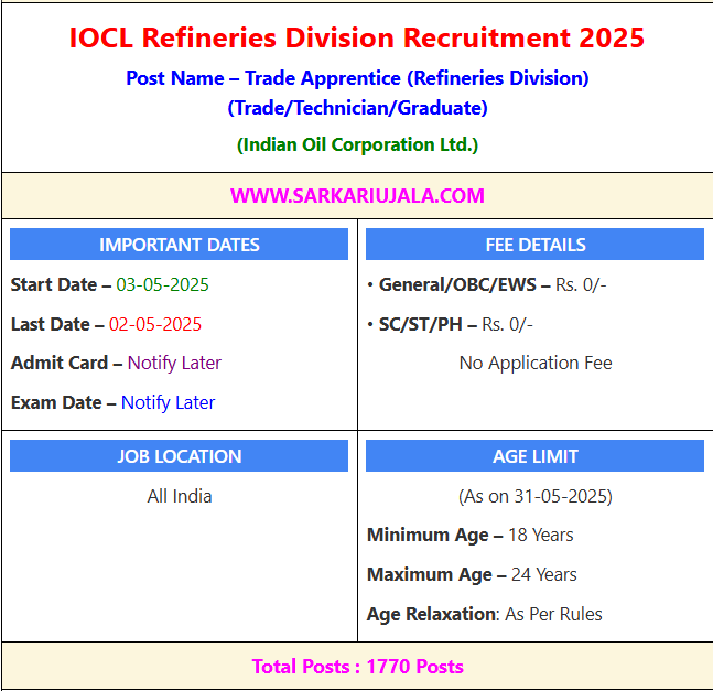 Post Description – IOCL Indian Oil Corporation Ltd. is inviting online applications for Trade Apprentice (Refineries Division) for 1770 posts. Interested people meet all the eligibility criteria, apply online Details Of Recruitment Of IOCL Refineries Division Online Form 2025Posts Name – Trade Apprentice Number Of Posts – 1770 Posts Pay Scale – As Per Rules Education Qualification – 10+2/ ITI/ Diploma/ B.A/ B.Com/ B.Sc/ BBA How to Apply Online IOCL Trade Apprentice Online Form 2025 – Candidates can apply through link provided below or they can also apply through official site of the Indian Oil Corporation Ltd before 02/June/2025. Required Documents For Online Application – 10th /12th /ITI/Diploma Mark sheet And Certificates Aadhar Card / Pan Card Passport Size Photo Signature Selection Mode – CBT Exam Merit List | |||||