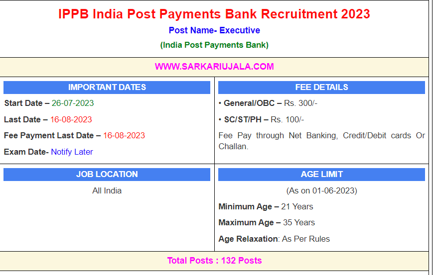 Post Description – IPPB India Post Payments Bank is inviting online applications for Executive Posts for 132 posts. Interested people meet all the eligibility criteria, apply online Details Of Recruitment Of India Post Payments Bank Executive Online Form 2023Posts Name – Executive Number Of Posts – 132 Posts Category Wise Posts – Assam – 26 Posts Chhattisgarh – 27 Posts Himachal Pradesh– 12 Posts Jammu & Kashmir- 07 Posts Ladakh – 01 Posts Arunachal Pradesh – 10 Posts Manipur – 09 Posts Meghalaya – 08 Posts Mizoram– 06 Posts Nagaland– 09 Posts Tripura– 05 Posts Uttarakhand– 12 Posts Pay Scale – As Per Rules Education Qualification – Graduate Degree in any discipline. How to Apply Online India Post Payments Bank Executive Online Form 2023 – Candidates can apply through link provided below or they can also apply through official site of the India Post Payments Bank before 16/August/2023. Required Documents For Online Application – Educational Mark sheet And Certificates Aadhar Card / Pan Card Passport Size Photo Signature Selection Mode – CBT Exam Merit List