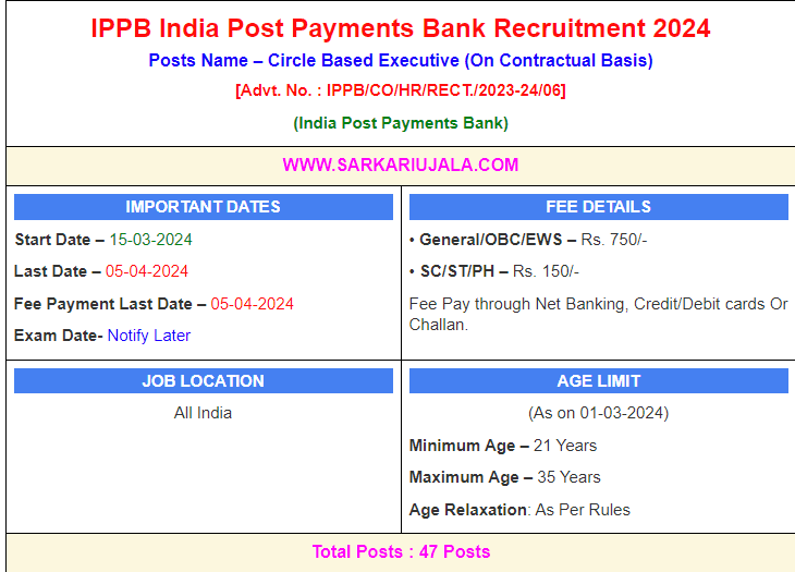 Post Description – IPPB India Post Payments Bank is inviting online applications for Executive Posts for 47 posts. Interested people meet all the eligibility criteria, apply online Details Of Recruitment Of India Post Payments Bank Executive Online Form 2024Posts Name – Executive Number Of Posts – 47 Posts Category Wise Posts – General – 21 Posts EWS – 04 Posts OBC – 12 Posts SC – 07 Posts ST – 03 Posts Pay Scale – As Per Rules Education Qualification – Graduate Degree in any discipline. How to Apply Online India Post Payments Bank Executive Online Form 2024 – Candidates can apply through link provided below or they can also apply through official site of the India Post Payments Bank before 05/April/2024. Required Documents For Online Application – Educational Mark sheet And Certificates Aadhar Card / Pan Card Passport Size Photo Signature Selection Mode – CBT Exam Merit List