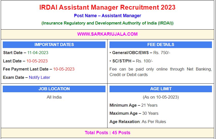 IRDAI Assistant Manager Recruitment 2023Post Name – Assistant Manager(Insurance Regulatory and Development Authority of India (IRDAI)) | |||||
