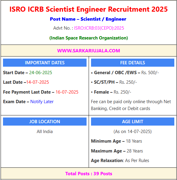 Post Description – ISRO Indian Space Research Organization is inviting online applications for Scientist / Engineer for 39 posts. Interested people meet all the eligibility criteria, apply online Details Of Recruitment Of ISRO ICRB Scientist / Engineer Online Form 2025Posts Name – Scientist / Engineer Number Of Posts – 39 Posts Category Wise Posts – Scientist/Engineer ‘SC'(Civil) – 18 Posts Scientist/Engineer ‘SC'(Electrical)– 10 Posts Scientist/Engineer ‘SC’ (Refrigeration & Air Conditioning) – 09 Posts Scientist/Engineer ‘SC’ (Architecture) – 01 Posts Scientist/Engineer ‘SC’ (Civil)-– Autonomous Body [PRL] – 01 Posts Pay Scale – As Per Rules Education Qualification – Scientist/Engineer ‘SC'(Civil) – BE/ B.Tech or equivalent in Civil Engineering with an aggregate minimum of 65% marks or CGPA 6.84/10 Scientist/Engineer ‘SC'(Electrical)– BE/ B.Tech or equivalent in Electrical Engineering OR Electrical and Electronics Engineering with an aggregate minimum of 65% marks or CGPA 6.84/10. Scientist/Engineer ‘SC’ (Refrigeration & Air Conditioning) – BE/ B.Tech or equivalent in Mechanical Engineering with Air Conditioning & Refrigeration or allied subjects as electives or as a core subject in any of the semesters, with an aggregate minimum of 65% marks or CGPA 6.84/10. Scientist/Engineer ‘SC’ (Architecture) – Bachelor degree in Architecture with an aggregate minimum of 65% or CGPA 6.84/10 and Valid Registration Certificate with Council of Architecture Scientist/Engineer ‘SC’ (Civil)-– Autonomous Body [PRL] – BE/ B.Tech or equivalent in Civil Engineering with an aggregate minimum of 65% marks or CGPA 6.84/10. How to Apply Online ISRO ICRB Scientist / Engineer Online Form 2025 – Candidates can apply through link provided below or they can also apply through official site of the Indian Space Research Organisation before 14/July/2025. Required Documents For Online Application – Educational Mark sheet And Certificates Aadhar Card / Pan Card Passport Size Photo Signature Selection Mode – Written Exam Interview Merit List