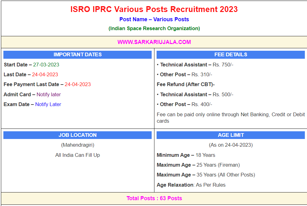 ISRO IPRC Various Posts Recruitment 2023Post Name – Various Posts(Indian Space Research Organization) | |||||