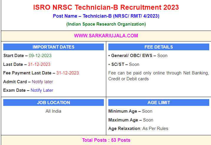 ISRO NRSC Technician-B Recruitment 2023Post Name – Technician-B (NRSC/ RMT/ 4/2023)(Indian Space Research Organization) | |||||