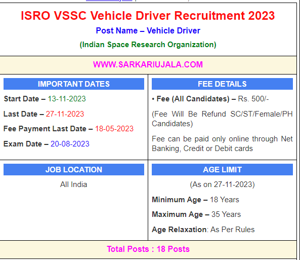 Post Description – ISRO Indian Space Research Organization is inviting online applications for Vehicle Driver for 18 posts. Interested people meet all the eligibility criteria, apply online Details Of Recruitment Of ISRO VSSC Vehicle Driver Online Form 2023Posts Name – Vehicle Driver Number Of Posts – 18 Posts Category Wise Posts – Light Vehicle Driver – 09 Posts General – 05 Posts OBC – 02 Posts SC– 01 Posts EWS – 01 Posts Heavy Vehicle Driver – 09 Posts General – 05 Posts OBC – 02 Posts SC– 01 Posts EWS – 01 Posts Pay Scale – Rs.19,900 – 63,200/- Education Qualification – Light Vehicle Driver – 10th Passed & Must possess LVD license & 3 years’ experience as Light Vehicle Driver. Heavy Vehicle Driver– 10th Passed & Must possess LVD license & Must possess valid Public Service Badge. 5 years’ experience out of which minimum 3 years as Heavy Vehicle Driver. How to Apply Online ISRO VSSC Vehicle Driver Online Form 2023 – Candidates can apply through link provided below or they can also apply through official site of the Indian Space Research Organization before 18/May/2023. Required Documents For Online Application – 10th Mark sheet And Certificates Driving License Aadhar Card / Pan Card Passport Size Photo Signature Selection Mode – Written Exam Skill Test Merit List