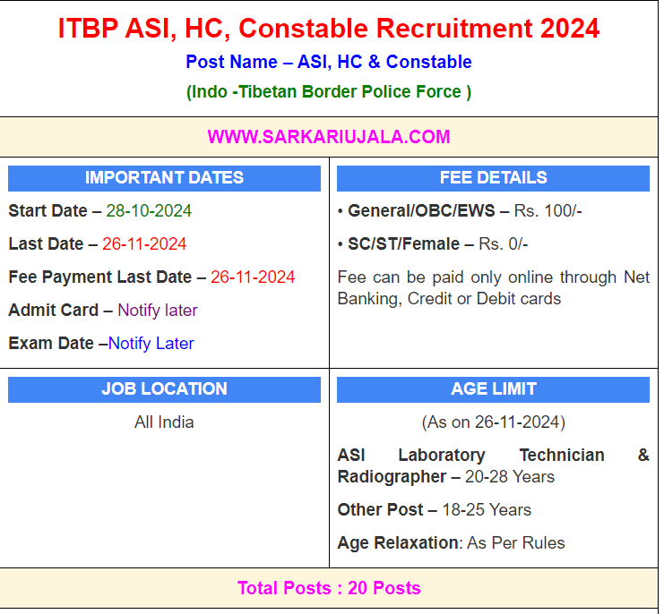 Post Description – ITBP Indo -Tibetan Border Police Force is inviting online applications for ASI, HC & Constable Various Trade for 20 posts. Interested people meet all the eligibility criteria, apply online Details Of Recruitment Of ITBP ASI, HC, Constable Online Form 2024 Posts Name – ASI, HC & Constable Various Trade Number Of Posts – 20 Posts Category Wise Posts – ASI Laboratory Technician – 07 Posts ASI Radiographer – 03 Posts ASI OT Technician – 01 Posts ASI Physiotherapist – 01 Posts Head Constable (Central Sterilization Room Assistant) – 01 Posts Constable Peon – 01 Posts Constable Telephone Operator Cum Receptionist – 02 Posts Constable Dresser – 03 Posts Constable Linen Keeper – 01 Posts Pay Scale – As Per Rules Education Qualification – ASI Laboratory Technician – 10+2 Passed with PCB Group Subjects and Diploma in Medical Laboratory Technology. And 1 Year Experience. ASI Radiographer – 10+2 Passed with PCB Subjects and Diploma in Radio Diagnosis. ASI OT Technician – 10+2 Passed and Diploma / Certificate in Operation Theater Technician. ASI Physiotherapist – 10+2 Passed and Diploma / Certificate in Physiotherapy. Head Constable (Central Sterilization Room Assistant) – 10+2 Passed and Certificate in Central Sterilization Room Assistant. Constable Peon – 10th Exam Passed. Constable Telephone Operator Cum Receptionist – 10th Exam Passed with 1 Year Experience as Telephone Operator in an Office OR Hospital. Constable Dresser – 10th Passed with 1 Year Experience as Dresser in Hospital / Clinic. Constable Linen Keeper – 10th Exam Passed with 1 Year Experience in Handling of Linen in a Hospital or Other Organization How to Apply Online ITBP ASI, HC, Constable Online Form 2024 – Candidates can apply through link provided below or they can also apply through official site of the Indo-Tibetan Border Police Force before 26/November/2024. Required Documents For Online Application – Educational Mark sheet And Certificates Aadhar Card / Pan Card Passport Size Photo Signature Selection Mode – Written Exam Skill Test PET/PST Merit List