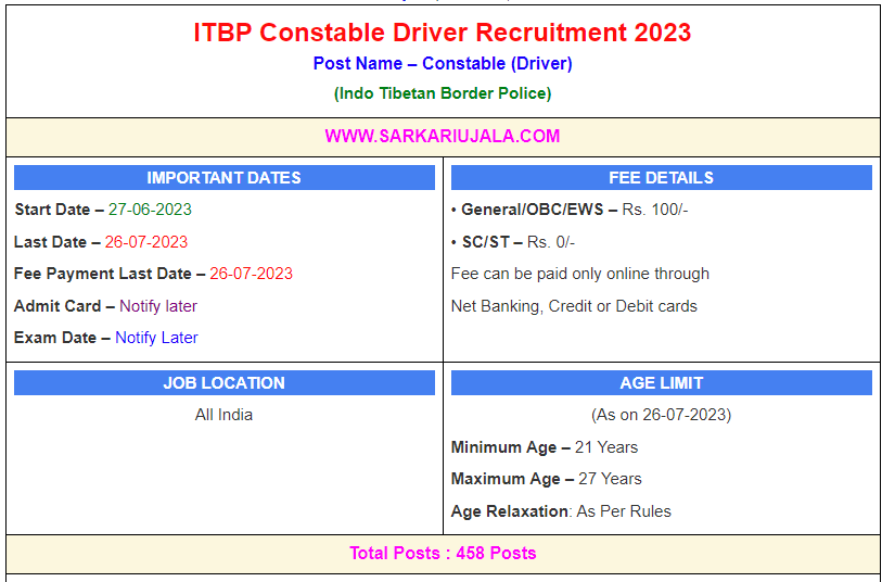 Post Description – ITBP Indo Tibetan Border Police is inviting online applications for Constable Driver for 458 posts. Interested people meet all the eligibility criteria, apply online Details Of Recruitment Of ITBP Constable Driver Online Form 2023Posts Name – Constable (Driver) Number Of Posts – 458 Posts Category Wise Posts – General – 195 Posts OBC – 110 Posts SC – 74 Posts ST– 37 Posts EWS– 42 Posts Pay Scale – As Per Rules Education Qualification – 10th Matric Passed And Having Heavy Vehicle Driving License. How to Apply Online ITBP Constable Driver Online Form 2023 – Candidates can apply through link provided below or they can also apply through official site of the Indo Tibetan Border Police before 26/July/2023. Required Documents For Online Application – 10th Mark sheet And Certificates Driving License Aadhar Card / Pan Card Passport Size Photo Signature Selection Mode – Written Exam PET/PST Skill Test Merit List