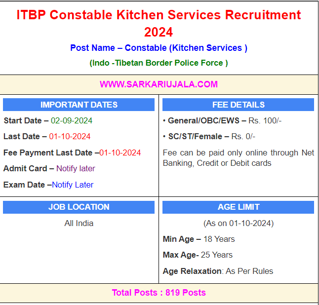 Post Description – ITBP Indo -Tibetan Border Police Force is inviting online applications for Kitchen Services for 819 posts. Interested people meet all the eligibility criteria, apply online Details Of Recruitment Of ITBP Veterinary Staff Online Form 2024 Posts Name – Kitchen Services (Constable) Number Of Posts – 819 Posts Category Wise Posts – General – 458 Posts OBC – 162 Posts SC – 48 Posts ST – 70 Posts EWS – 81 Posts Pay Scale – Rs. 21,700/- to Rs. 69,100/- (7th CPC) Education Qualification – 10th Passed From A Recognised Board And NSQF Level I Course in Food Production OR Kitchen from National Skill Development Corporation OR from the Institutes Recognized by National Skill Development Corporation. How to Apply Online ITBP Constable Kitchen Services Online Form 2024 – Candidates can apply through link provided below or they can also apply through official site of the Indo-Tibetan Border Police Force before 01/October/2024. Required Documents For Online Application – Educational Mark sheet And Certificates Aadhar Card / Pan Card Passport Size Photo Signature Selection Mode – Written Exam Skill Test PET/PST Merit List