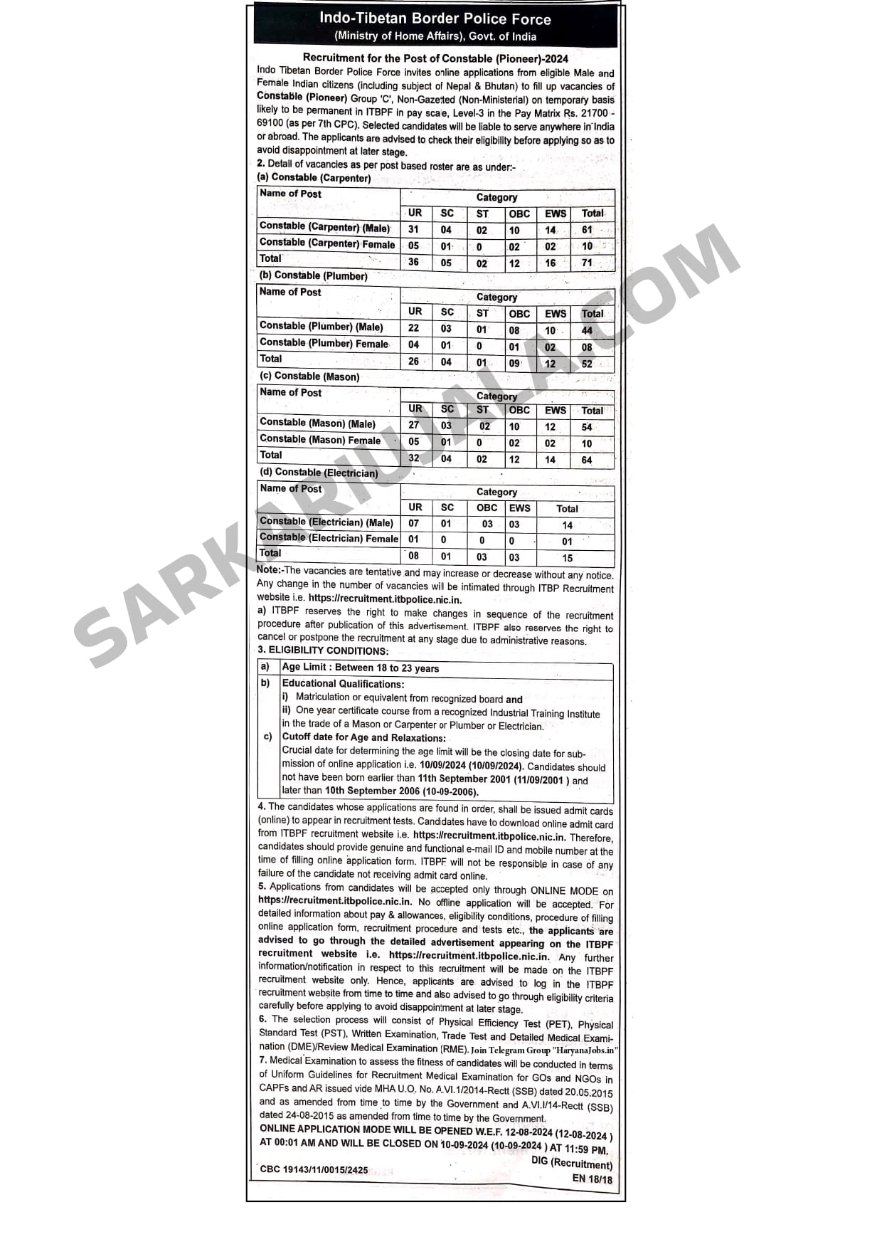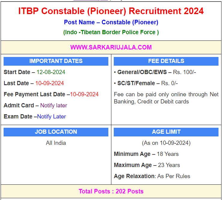 Post Description – ITBP Indo -Tibetan Border Police Force is inviting online applications for Constable (Pioneer) for 202 posts. Interested people meet all the eligibility criteria, apply online Details Of Recruitment Of ITBP Constable (Pioneer) Online Form 2024 Posts Name – Constable (Pioneer) Number Of Posts – 202 Posts Category Wise Posts – Constable (Carpenter) – 71 Posts Constable (Plumber) – 52 Posts Constable (Mason) – 64 Posts Constable (Electrician) – 15 Posts Pay Scale – Rs.21,700 – 69,100/- (7th CPC ) Education Qualification – 10th Passed And ITI Certificate In Related Trade Height –170 Cms Chest – 80-85 Cms Racing – 1.6 Kms In 07 Minute 30 Second High Jump – 3.5 Feet in 3 Chance Long Jump – 11 Feet in 3 Chance How to Apply Online ITBP Constable (Pioneer) Online Form 2024 – Candidates can apply through link provided below or they can also apply through official site of the Indo-Tibetan Border Police Force before 10/September/2024. Required Documents For Online Application – Educational Mark sheet And Certificates Aadhar Card / Pan Card Passport Size Photo Signature Selection Mode – Written Exam Skill Test PET/PST Merit List