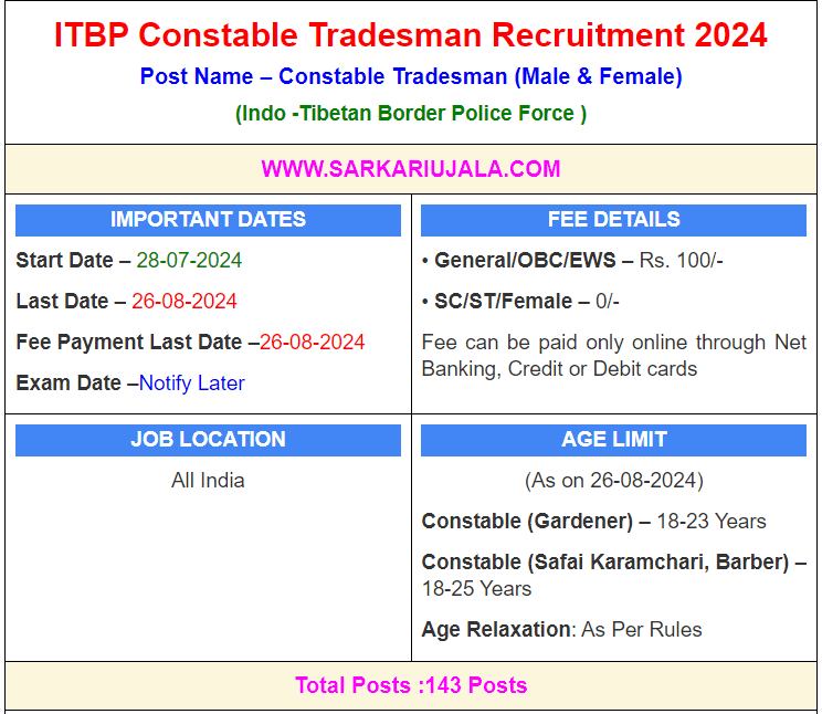 Post Description – ITBP Indo -Tibetan Border Police Force is inviting online applications for Constable Tradesman for 143 posts. Interested people meet all the eligibility criteria, apply online Details Of Recruitment Of ITBP Constable Tradesman Online Form 2024 Posts Name – Constable Tradesman (Safai Karamchari, Barber & Gardener) Number Of Posts – 143 Posts Category Wise Posts – Constable Gardener – 37 Posts Constable Safai Karmchari – 101 Posts Constable Barber – 05 Posts Pay Scale – Rs.21,700 – 69,100/- (Level 3 ) Education Qualification – Constable Gardener – 10th Passed with 2 Year Experience OR ITI Certificate in Related Trade. Constable Constable( Safai Karamchari & Barber) – 10th Passed From Any Recognized Board in India. How to Apply Online ITBP Constable Tradesman Online Form 2024 – Candidates can apply through link provided below or they can also apply through official site of the Indo-Tibetan Border Police Force before 26/August/2024. Required Documents For Online Application – Educational Mark sheet And Certificates Aadhar Card / Pan Card Passport Size Photo Signature Selection Mode – Written Exam PET/PST Skill Test Merit List