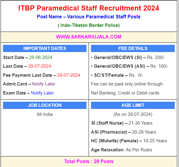Post Description – ITBP Indo-Tibetan Border Police is inviting online applications for Paramedical Staff for 29 posts. Interested people meet all the eligibility criteria, apply online Details Of Recruitment Of ITBP Paramedical Staff Online Form 2024Posts Name – Paramedical Staff Number Of Posts – 29 Posts Sub Inspector (Staff nurse) – 10 Posts Assistant Sub Inspector (Pharmacist) – 05 Posts Head Constable (Midwife) (Only Female)- 14 Posts Pay Scale – SI (Staff nurse) – Rs. 35400-112400/- (Level-6) ASI (Pharmacist) – Rs. 29200-92300/- (Level-5) HC (Midwife) (Only Female) – Rs. 25500-81100/- (Level-4) Education Qualification – SI (Staff nurse) – 12th Passed From Any Board And Must have Passing in GNM And Registered with Central Nursing Council or State Nursing Council. ASI (Pharmacist) – 12th Passed With PCB (Physics, Chemistry & Biology) And Diploma In Pharmacy. HC (Midwife) (Only Female) – 10th Passed And ANM Exam Passed And Registered with Central Nursing Council or State Nursing Council. Physical Standard Height & Chest For SI (Staff nurse) & ASI (Pharmacist) – Height: 10 cm (Male), 150Cm (Female) Chest : 80cm -85 Cm Height & Chest For ST– Height: 162.5 cm (Male), 150Cm (Female) Chest – 77cm – 82 cm Height For HC (Midwife) (Only Female) – Height: 157 cm (Other), 150Cm (ST) How to Apply Online ITBP Paramedical Staff Online Form 2024 – Candidates can apply through link provided below or they can also apply through official site of the Indo-Tibetan Border Police before 28/July/2024. Required Documents For Online Application – 10th/12th /Diploma/GNM/ANM Certificates Other Certificates Aadhar Card / Pan Card Passport Size Photo Signature Selection Mode – Written Examination PET/PST Skill Test Final Merit List