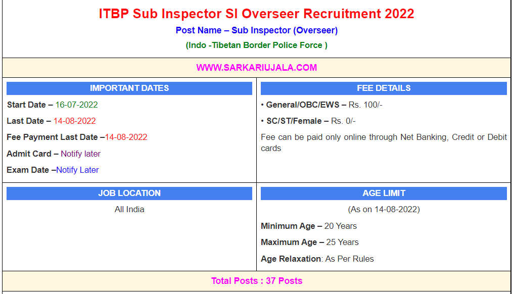 Post Description – ITBP Indo -Tibetan Border Police Force is inviting online applications for Sub Inspector (Overseer) for 37 posts. Interested people meet all the eligibility criteria, apply online Details Of Recruitment Of ITBP SI Overseer Online Form 2022 Posts Name – Sub Inspector (Overseer) Number Of Posts – 37 Posts Category Wise Posts – SI (Male) – 32 posts General – 07 Posts OBC – 15 Posts SC – 05 Posts ST – 02 Posts EWS – 03 Posts SI (Female) – 05 posts General – 01 Posts OBC – 03 Posts SC – 01 Posts ST – 0 Posts EWS – 0 Posts Pay Scale – Rs.35,400 – 1,12,400/- (7th CPC ) Education Qualification – 10th Passed With Diploma In Civil Engineering. How to Apply Online ITBP SI Overseer Online Form 2022 – Candidates can apply through link provided below or they can also apply through official site of the Indo-Tibetan Border Police Force before 14/Aug/2022. Required Documents For Online Application – Educational Mark sheet And Certificates Aadhar Card / Pan Card Passport Size Photo Signature Selection Mode – Written Examination PET/PST Merit List