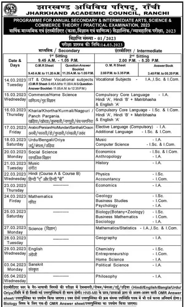 JAC Jharkhand Board Annual Exam 2023 | |||||