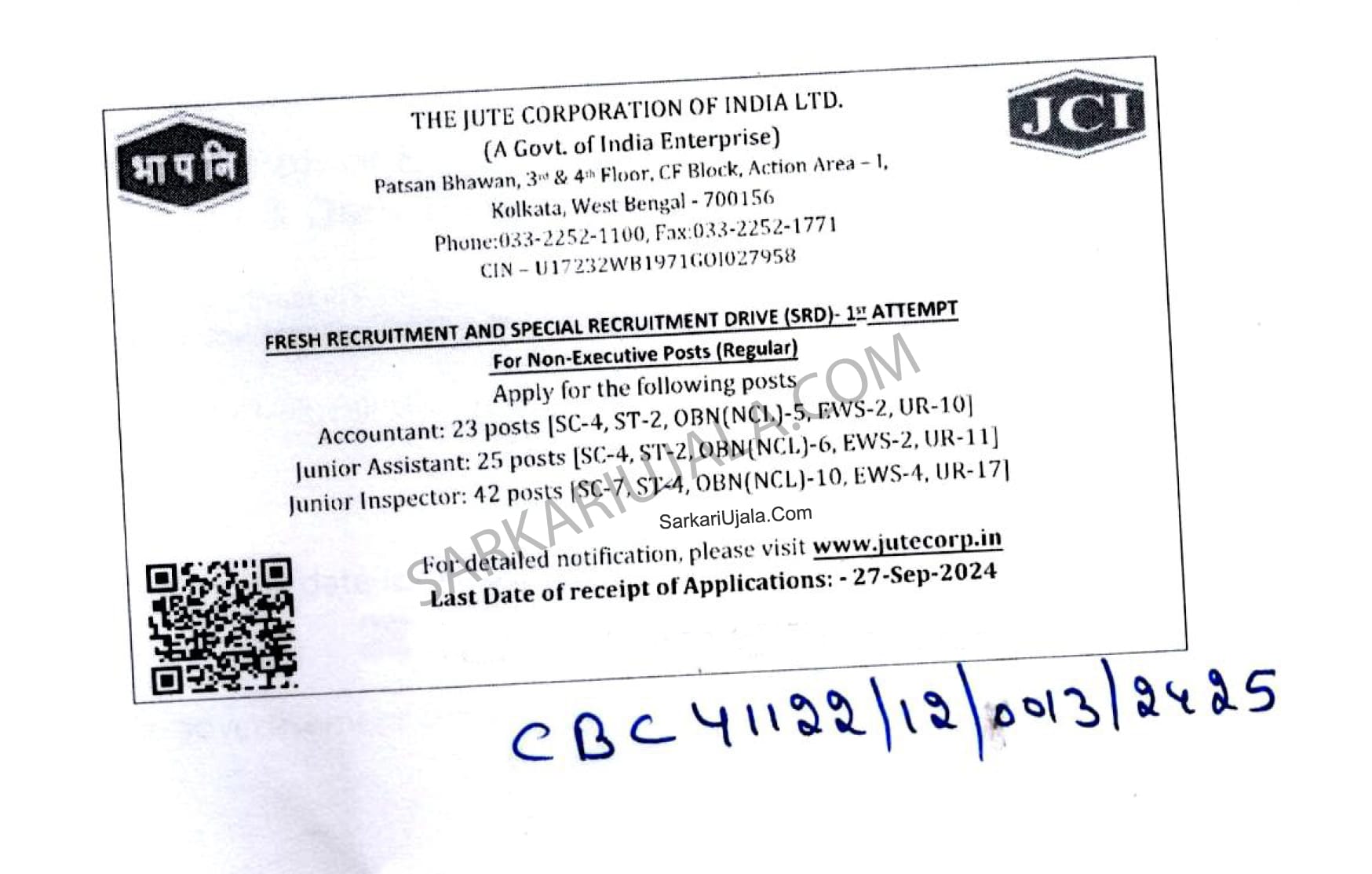 JCI Non-Executive Post Recruitment 2024Post Name – Non-Executive Posts(The Jute Corporation of India Ltd) | |||||