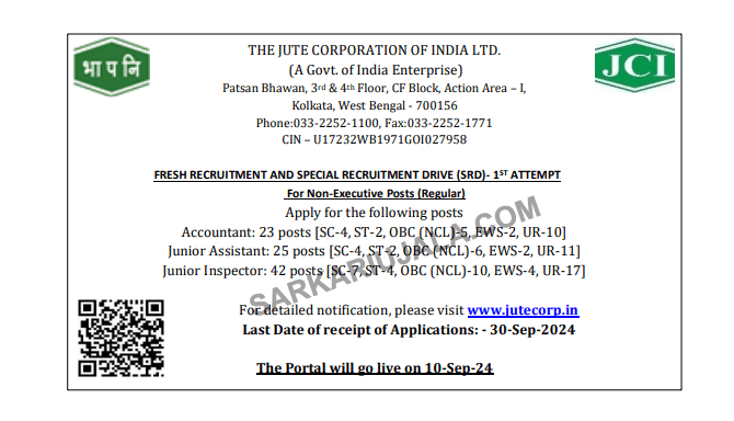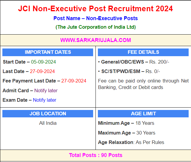 Post Description – The Jute Corporation of India Ltd is inviting online applications for Non-Executive Posts for 90 posts. Interested people meet all the eligibility criteria, apply online Details Of Recruitment Of JCI Non-Executive Posts Online Form 2024Posts Name – Non-Executive Posts Number Of Posts – 90 Posts Category Wise Posts – Accountant – 23 Posts Junior Assistant – 25 Posts Junior Inspector – 42 Posts Pay Scale – Accountant – Rs.28600 – 115000/- Junior Assistant /Junior Inspector – Rs.21500 – 86500/- Education Qualification – Accountant – M. Com with Advanced Accountancy and auditing as a special subject with 5 Years’ experience in maintaining of commercial accounts including reconciliation and final accounts / experience in handling cash and records. Junior Assistant– Graduate from a recognized university with experience in using computers (MS word & Excel) and minimum typing speed is 40 wpm in English. Junior Inspector –12th Passed with 3 Years’ experience in purchase / sale of raw jute; its grading and assorting / bailing / storage / transportation How to Apply Online JCI Non-Executive Posts Online Form 2024 – Candidates can apply through link provided below or they can also apply through official site of the The Jute Corporation of India Ltd before 30/September/2024. Required Documents For Online Application – Educational Mark sheet And Certificates Aadhar Card / Pan Card Passport Size Photo Signature Selection Mode – Written Exam Medical Final Merit List | |||||