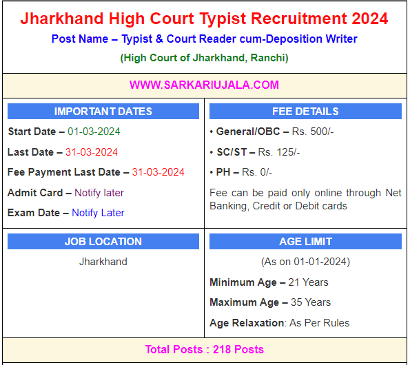 Jharkhand High Court Typist Recruitment 2024Post Name – Typist & Court Reader cum-Deposition Writer(High Court of Jharkhand, Ranchi) | |||||