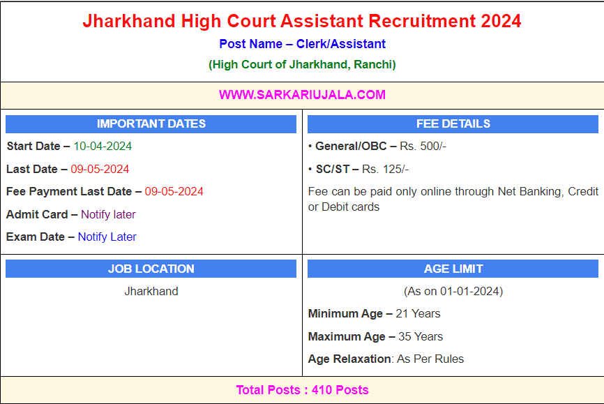 Post DescriptionHigh Court of Jharkhand, Ranchi is inviting online applications for Clerk/Assistant for 410 posts. Interested people meet all the eligibility criteria, apply online