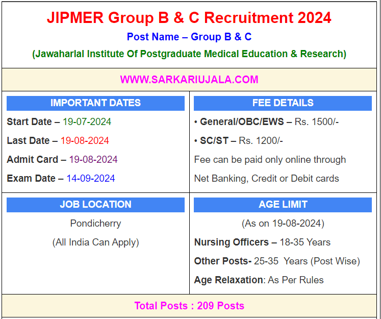 Post Description – JIPMER Jawaharlal Institute Of Postgraduate Medical Education & Research is inviting online applications for Group B & C for 209 posts. Interested people meet all the eligibility criteria, apply online Details Of Recruitment Of JIPMER Group B & C Post Online Form 2024Posts Name – Group B & C Number Of Posts – 209 Posts Category Wise Posts – Junior Administrative Assistant Group C – 24 Posts Nursing Officer Group B – 154 Posts Junior Translation Officer JTO Group B – 1 Post Junior Occupational Therapist Group B – 1 Post Medical Laboratory Technologist Group B – 4 Posts Tutor in Speech Pathology & Audiology Group B – 1 Post X Ray Technician Radiotherapy Group B – 1 Post X Ray Technician Radio-diagnosis Group B – 5 Posts Technical Assistant Electronics Physiology Group B – 1 Post Technical Assistant Nuclear Medicine Group B – 1 Post Anesthesia Technician Group C – 1 Post Audiology Technician Group C – 1 Post Pharmacist Group C – 6 Posts Respiratory Laboratory Technician Group C – 2 Posts Stenographer Grade II Group C – 1 Post Cartographic Technician Group C – 4 Posts Pay Scale – As Per Rules Education Qualification – Junior Administrative Assistant Group C- 10+2 Intermediate, English Typing 35 WPM or Hindi Typing 30 WPM And Max Age: 30 Years Nursing Officer Group B – Degree/Diploma in General Nursing & Midwifery, Nursing Council Registration & Max Age: 35 Years Junior Translation Officer JTO Group B- Master’s Degree in Hindi/English or Any Subject with Hindi/English as a Compulsory Subject, And Max Age- 30 Years Junior Occupational Therapist Group B – Degree in Occupational Therapy with 2 Years Experience or Diploma in Occupational Therapy with 3 Years Experience, And Max Age 35 Years Medical Laboratory Technologist Group B- Bachelor’s Degree in Medical Laboratory Science/Technology with 2 Years Experience And Max Age 30 Years Tutor in Speech Pathology & Audiology Group B- Master’s Degree in Speech and Language Pathology or Audiology or Degree in Speech and Language with 3 Years Experience, And Max Age 35 Years X Ray Technician Radiotherapy Group B – B.Sc in Radiation Technology/Radiotherapy Technology, AERB E-Lora Registration with 2 Years Experience, And Max Age 30 years X Ray Technician Radio-diagnosis Group B- B.Sc in Radiography /Medical Imaging Technology with 2 Years Experience, And Max Age 30 Years. Technical Assistant Electronics Physiology Group B – BE/B.Tech in Electronics or Electrical or Diploma in Electronics/Electrical with 2 Years Experience, And Max Age 35 years. Technical Assistant Nuclear Medicine Group B- Degree in Nuclear Medicine Technology or Degree in Physics /Chemistry /Biochemistry /Microbiology /Life Science with PG Diploma in Medical Radiation and Isotope Technology DMRIT And Max Age: 35 Anesthesia Technician Group C- Degree in Anesthesia Technology or Diploma in Anesthesia Technology with 1 Year Experience, And Max Age 30 Years Audiology Technician Group C- Diploma in Hearing Language and Speech DHLS or Diploma in Hearing Aid or Earmould Technology DHA&ET, RCI Registration And Max Age 25 Years. Pharmacist Group C- Degree in Pharmacy with 1 Year Experience or Diploma in Pharmacy with 2 Years Experience, Pharmacy Council Registration, And Max Age 30 years Respiratory Laboratory Technician Group C – Bachelor’s Degree in Science B.Sc MLT, And Max Age 30 Years Stenographer Grade II Group C – 10+2 Intermediate, Dictation 10 Min at 80 WPM, Transcription: 65 Min English/75 Min Hindi on Manual Typewriter or 50 Min English/65 Min Hindi on Computer, And Max Age 27 Years Cartographic Technician Group C- Bachelor’s Degree in Science B.Sc Cardiac Technology or Cardiac Laboratory Technician or Cardiac Catheterization Laboratory Technology, And Max Age 30 Years. How to Apply Online JIPMER Group B & C Post Online Form 2024 – Candidates can apply through link provided below or they can also apply through official site of the JIPMER before 19/August/2024. Required Documents For Online Application – Educational Mark sheet And Certificates Aadhar Card / Pan Card Passport Size Photo Signature Selection Mode – Written Exam Merit List