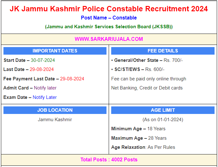 Post Description – JKSSB Jammu and Kashmir Services Selection Board is inviting online applications for Constable for 4002 posts. Interested people meet all the eligibility criteria, apply online Details Of Recruitment Of JK Police Constable Online Form 2024Posts Name – Police Constable Number Of Posts – 4002 Posts Category Wise Posts – Constable (Armed/ IRP) – 1689 Posts Constable (SDRF) – 100 Posts Constable (Telecom) – 502 Posts Constable (Photographer) – 22 Posts Constable (Executive)- Jammu – 1249 Posts Constable (Executive)- Kashmir – 440 Posts Pay Scale – Rs.19900 – 63200/- (Level – 2) Education Qualification – Constable (Armed/ IRP) – 10th Passed From Recognised Board Constable (SDRF) – 10th Passed From Recognised Board Constable (Telecom) – 10+2 Passed With Science From Recognised Board Constable (Photographer) – 10+2 with Science along with 6 months computer course and two years experience in videography/photography Constable (Executive)- Jammu – 10th Passed From Recognised Board Constable (Executive)- Kashmir – 10th Passed From Recognised Board Domicile : – Candidates applying for the advertised posts must be domiciles of the Union Territory of Jammu & Kashmir and possess a valid domicile certificate issued by the competent authority. Physical Standard Height: 5 Feet , 6 Inch (Male), 5 Feet 2 Inch (Female) Chest : 33 Inch To 33.5 Inch Running- 1600 Meter in 6 Minute 3 Second (Male) , 1000 Meters in 6 Minute 30 Seconds (Female) How to Apply Online JK Police Constable Online Form 2024 – Candidates can apply through link provided below or they can also apply through official site of the Jammu and Kashmir Services Selection Board before 07/September/2024. Required Documents For Online Application – 10th / 12th Mark sheet And Certificates Aadhar Card / Pan Card Passport Size Photo Signature Selection Mode – Written Exam PET/PST Medical Final Merit List | |||||