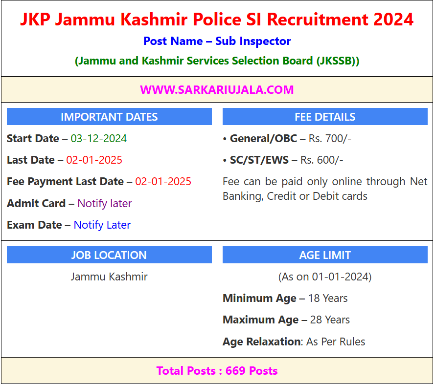 Post Description – The JK Police Sub Inspector Recruitment 2024 has been announced by the Jammu and Kashmir Services Selection Board (JKSSB) for 669 posts. The application process will start on 3rd December 2024 and end on 2nd January 2025, with the same date as the last day for fee payment. The application fee is Rs. 700 for General/OBC and Rs. 600 for SC/ST/EWS candidates, payable online through Net Banking, Credit, or Debit cards. The age limit is 18 to 28 years as of 1st January 2024, with relaxation as per rules. Admit card and exam dates will be announced later. The job location is Jammu and Kashmir. Details Of Recruitment Of JK Police Sub Inspector Online Form 2024Posts Name – Sub Inspector Number Of Posts – 669 Posts Category Wise Posts – OM (Open Merit): 267 posts SC (Scheduled Caste): 53 posts ST-1 (Scheduled Tribe-1): 67 posts ST-2 (Scheduled Tribe-2): 67 posts OBC (Other Backward Class): 54 posts RBA (Resident of Backward Area): 67 posts ALC/IB (Actual Line of Control/International Border): 27 posts EWS (Economically Weaker Section): 67 posts Pay Scale – Level-6C (₹35,700 – ₹1,13,100) Education Qualification – Bachelor Degree From Any Recognised University. Domicile : – Candidates applying for the advertised posts must be domiciles of the Union Territory of Jammu & Kashmir and possess a valid domicile certificate issued by the competent authority. Physical Standard Height: 5 Feet , 6 Inch (Male), 5 Feet 2 Inch (Female) Chest : 32 Inch To 33.5 Inch Running- 1600 Meter in 6 Minute 30 Second (Male) , 1000 Meters in 6 Minute 30 Seconds (Female) How to Apply Online JK Police SI Sub Inspector Online Form 2024 – Candidates can apply through link provided below or they can also apply through official site of the Jammu and Kashmir Services Selection Board before 02/January/2025. Required Documents For Online Application – Educational Mark sheet And Certificates Aadhar Card / Pan Card Passport Size Photo Signature Selection Mode – Written Exam PET/PST Medical Final Merit List | |||||