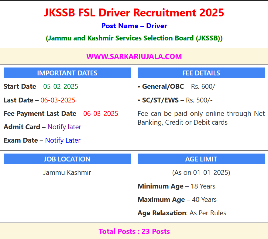 Post Description – The Jammu and Kashmir Services Selection Board (JKSSB) has announced the recruitment for the post of Driver in 2025. Interested candidates can apply online from February 5, 2025, to March 6, 2025. To be eligible for this position, applicants must have passed at least Matric (10th grade) and at most 12th grade. Additionally, candidates must hold a valid Heavy Goods Vehicle (HGV) or Public Service Vehicle (PSV) driving license. Details Of Recruitment Of JKSSB FSL Driver Online Form 2025Posts Name – Driver Number Of Posts – 23 Posts Category Wise Posts – OM (Open Merit): 10 posts SC (Scheduled Caste): 02 posts ST-1 (Scheduled Tribe-1): 02 posts ST-2 (Scheduled Tribe-2): 02 posts OBC (Other Backward Class): 02 posts RBA (Resident of Backward Area): 02 posts ALC/IB (Actual Line of Control/International Border): 01 posts EWS (Economically Weaker Section): 02 posts Pay Scale – Level-2 (₹19,900 – ₹63,200) Education Qualification – Minimum Matric And Maximum 12th Passed And HGV/ PSV Driving License. Domicile : – Candidates applying for the advertised posts must be domiciles of the Union Territory of Jammu & Kashmir and possess a valid domicile certificate issued by the competent authority. How to Apply Online JK Police SI Sub Inspector Online Form 2025 – Candidates can apply through link provided below or they can also apply through official site of the Jammu and Kashmir Services Selection Board before 06/March/2025. Required Documents For Online Application – Educational Mark sheet And Certificates Driving Licence Aadhar Card / Pan Card Passport Size Photo Signature Selection Mode – Written Exam Driving Test Medical Final Merit List | |||||