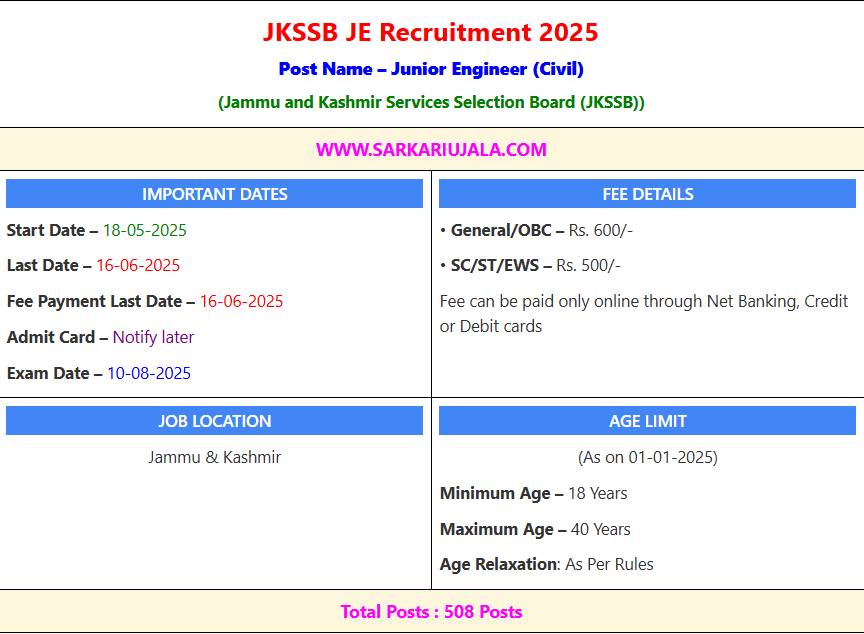 Post Description – JKSSB (Jammu & Kashmir Services Selection Board) has announced recruitment for Junior Engineer posts in 2025. Candidates possessing a Degree or Diploma in the relevant field can apply online from 18 May to 16 June 2025. Eligible candidates can apply through the online form using the link given below. Details Of Recruitment Of JKSSB JE Online Form 2025Posts Name – Junior Engineer Number Of Posts – 508 Posts Category Wise Posts – OM (Open Merit)– 203 posts SC (Scheduled Caste)- 40 posts ST-1 (Scheduled Tribe-1)– 51 posts ST-2 (Scheduled Tribe-2)– 51 posts OBC (Other Backward Class)– 41 posts RBA (Resident of Backward Area)– 51 posts ALC/IB (Actual Line of Control/International Border)– 21 posts EWS (Economically Weaker Section)– 50 posts Pay Scale – Level-2 (₹35,400 – ₹112,400) Education Qualification – Degree/ Diploma in Related Field Domicile : – Candidates applying for the advertised posts must be domiciles of the Union Territory of Jammu & Kashmir and possess a valid domicile certificate issued by the competent authority. How to Apply Online JKSSB JE Online Form 2025 – Candidates can apply through link provided below or they can also apply through official site of the Jammu and Kashmir Services Selection Board before 16/June/2025. Required Documents For Online Application – Educational Mark sheet And Certificates Driving Licence Aadhar Card / Pan Card Passport Size Photo Signature Selection Mode – Written Exam Driving Test Medical Final Merit List | |||||