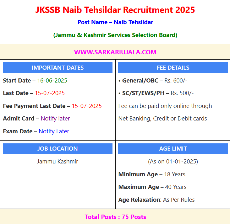 Post Description – JKSSB Jammu & Kashmir Services Selection Board is inviting online applications for Naib Tehsildar for 75 posts. Interested people meet all the eligibility criteria, apply online Details Of Recruitment Of JKSSB Naib Tehsildar Online Form 2025 Posts Name – Naib Tehsildar Number Of Posts – 75 Posts Category Wise Posts – OM – 30 Posts SC – 06 Posts ST-1 – 08 Posts ST-2 – 08 Posts OBC – 06 Posts ALC/IB – 03 Posts RBA – 07 Posts EWS – 07 Posts Pay Scale – As Per Rules Education Qualification – Graduation With Knowledge Of Urdu. How to Apply Online JKSSB Naib Tehsildar Online Form 2025 – Candidates can apply through link provided below or they can also apply through official site of the Jammu & Kashmir Services Selection Board before 15/July/2025. Required Documents For Online Application – Educational Mark sheet And Certificates Aadhar Card / Pan Card Passport Size Photo Signature Selection Mode – Written Exam Medical Final Merit List | |||||