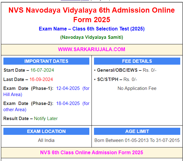 NVS Navodaya Vidyalaya 6th Admission Online Form 2025Exam Name – Class 6th Selection Test (2025)(Navodaya Vidyalaya Samiti) | |||||