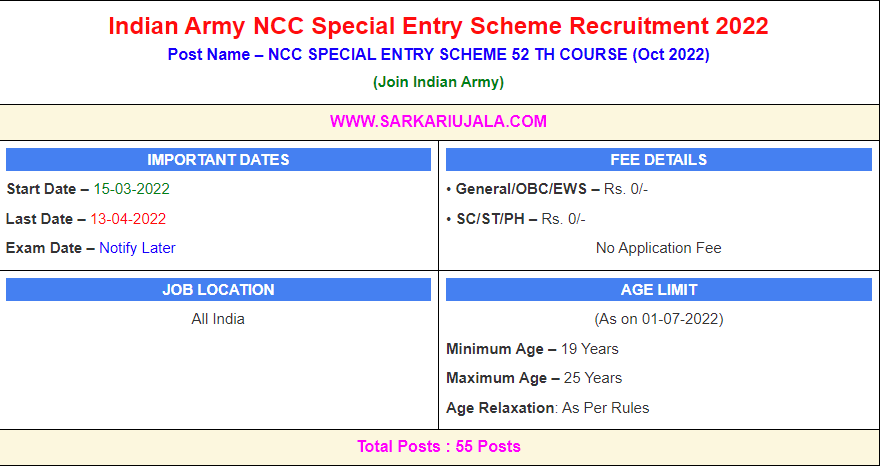 Indian Army NCC Special Entry Scheme Recruitment 2022Post Name – NCC SPECIAL ENTRY SCHEME 52 TH COURSE (Oct 2022)(Join Indian Army) | |||||