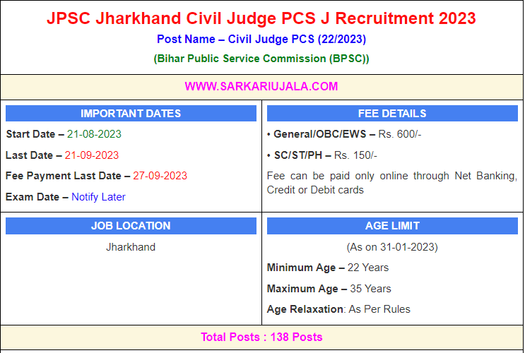 Post DescriptionJPSC Jharkhand Public Service Commission is inviting online applications for Civil Judge PCS for 138 posts. Interested people meet all the eligibility criteria, apply online