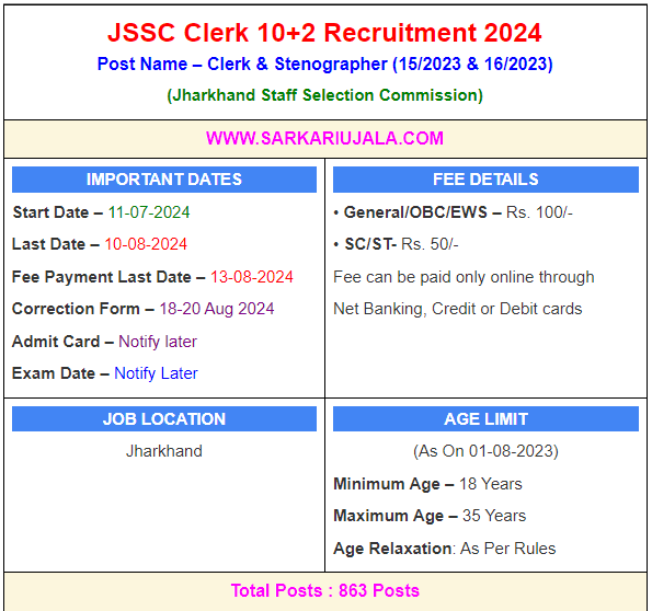 JSSC Clerk 10+2 Recruitment 2024Post Name – Clerk & Stenographer (15/2023 & 16/2023)(Jharkhand Staff Selection Commission) | |||||