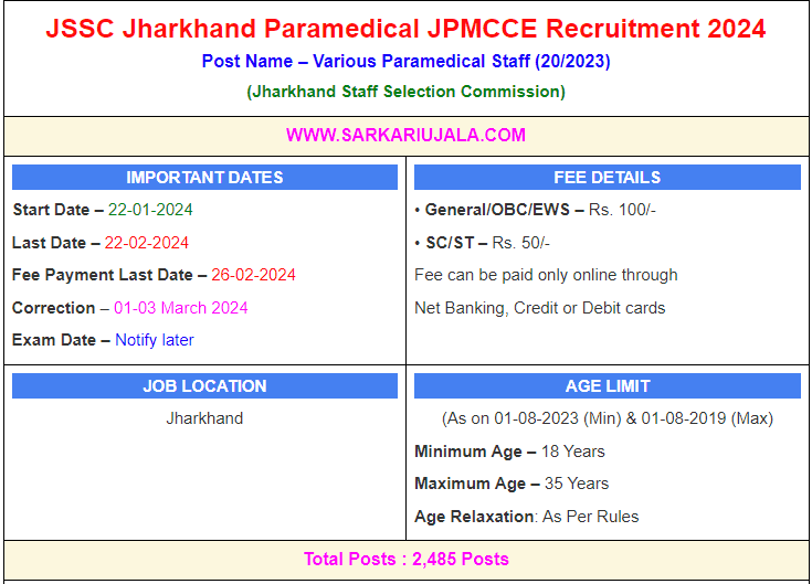 Post Description – JSSC Jharkhand Staff Selection Commission is inviting online applications for Various Paramedical Staff for 2485 posts. Interested people meet all the eligibility criteria, apply online Details Of Recruitment Of JSSC Jharkhand Paramedical JPMCCE Online Form 2024Posts Name – Various Paramedical Staff Number Of Posts – 2485 Posts Pharmacist – 560 Posts Laboratory Experimental – 636 Posts X-Ray Technician – 116 Posts Nurse Grade A – 1,173 Posts Pay Scale – as per rules Education Qualification – Pharmacist – 10th / 12th Passed And Degree / Diploma in Pharmacy with Registration in Council. Laboratory Experimental – 10th / 12th Exam And Laboratory Experimental / Lab Technician 1 Year Training X-Ray Technician – 12th (Science) Exam with Diploma in Radiography / X Ray / CT Scan / USG / MRI Technician with Registration in Council. Nurse Grade A – 12th Passed with PCB with 3 Year 6 Month GNM Certificate with Registration in Council. How to Apply Online JSSC Jharkhand Paramedical JPMCCE Online Form 2024 – Candidates can apply through link provided below or they can also apply through official site of the Jharkhand Staff Selection Commission before 22/February/2024. Required Documents For Online Application – Educational Mark sheet And Certificates Aadhar Card / Pan Card Passport Size Photo Signature Selection Mode – Written Exam Skill Test Merit List
