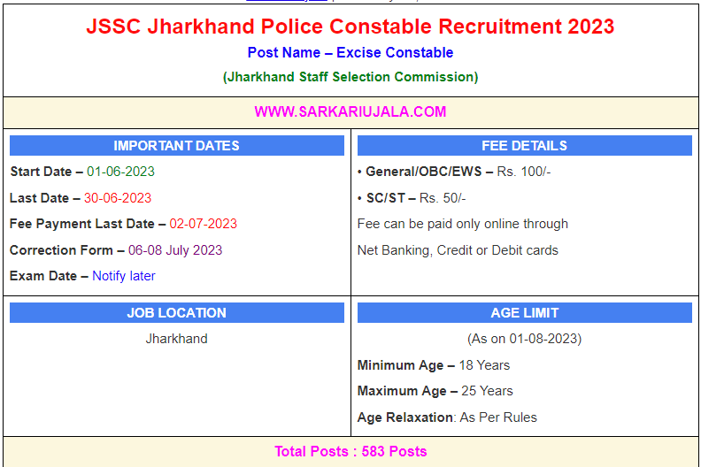 Post Description – JSSC Jharkhand Staff Selection Commission is inviting online applications for Excise Police Constable for 583 posts. Interested people meet all the eligibility criteria, apply online Details Of Recruitment Of JSSC Jharkhand Police Constable Online Form 2023Posts Name – Excise Constable Number Of Posts – 583 Posts Category Wise Posts – General – 237 Posts BC I – 50 Posts BC II – 32 Posts SC – 148 Posts ST – 57 Posts EWS – 59 Posts Pay Scale – Rs.19900 – 63200/- (Level 2) Education Qualification – 10th Passed From A Recognized Board. Physical Standard Height & Chest For General/OBC Height: 160 cm (Male), 148Cm (Female) Chest : 81cm -86 Cm Height & Chest For SC/ST– Height: 155 cm (Male), 148Cm (Female) Chest – 79cm – 84 cm Running- 10km in 60 Minute (Male) ,05 KM in 40 Minute (Female) How to Apply Online JSSC Jharkhand Police Constable Online Form 2023 – Candidates can apply through link provided below or they can also apply through official site of the Jharkhand Staff Selection Commission before 30/June/2023. Required Documents For Online Application – Educational Mark sheet And Certificates Aadhar Card / Pan Card Passport Size Photo Signature Selection Mode – Written Examination PET/PST Final Merit List
