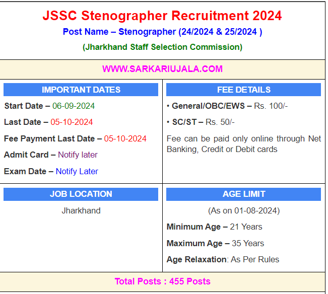 Post Description – JSSC Jharkhand Staff Selection Commission is inviting online applications for Stenographer for 455 posts. Interested people meet all the eligibility criteria, apply online Details Of Recruitment Of JSSC Jharkhand Stenographer Online Form 2024Posts Name – Stenographer Number Of Posts – 455 Posts Category Wise Posts – General – 182 Posts SC – 49 Posts ST – 37 Posts BC 1 – 45 Posts BC 2 – 27 Posts EWS – 45 Posts Pay Scale – Rs. 25500 – 81100/- Education Qualification – Graduation Degree From Any Recognised University And Stenography How to Apply Online JSSC Jharkhand Stenographer Online Form 2024 – Candidates can apply through link provided below or they can also apply through official site of the Jharkhand Staff Selection Commission before 14/August/2024. Required Documents For Online Application – Educational Mark sheet And Certificates Aadhar Card / Pan Card Passport Size Photo Signature Selection Mode – CBT/OMR Exam Skill Test Merit List
