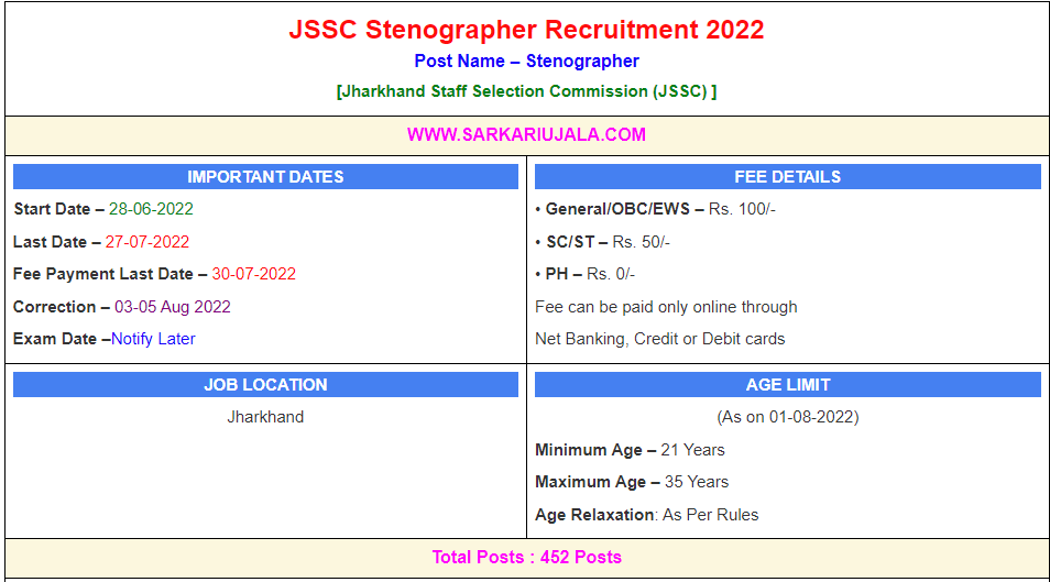 Post Description – JSSC Jharkhand Staff Selection Commission is inviting online applications for Stenographer for 452 posts. Interested people meet all the eligibility criteria, apply online Details Of Recruitment Of JSSC Stenographer Online Form 2022Posts Name – Stenographer Number Of Posts – 452 Posts Category Wise Posts – General – 181 Posts BC – 27 Posts EBC – 36 Posts SC – 45 Posts ST – 118 Posts EWS – 45 Posts Pay Scale – Rs.25500 – 81100/- Education Qualification – Bachelor Degree In Any Subject How to Apply Online JSSC Stenographer Online Form 2022 – Candidates can apply through link provided below or they can also apply through official site of the Jharkhand Staff Selection Commission before 27/July/2022. Required Documents For Online Application – Educational Mark sheet And Certificates Aadhar Card / Pan Card Passport Size Photo Signature Selection Mode – Written Examination Skill Test Final Merit List