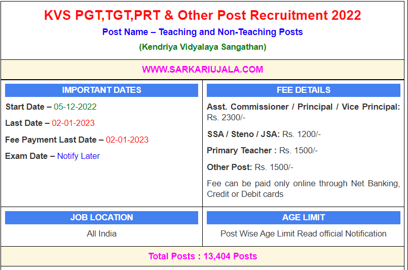 KVS PGT,TGT,PRT & Other Post Recruitment 2022Post Name – Teaching and Non-Teaching Posts(Kendriya Vidyalaya Sangathan) | |||||