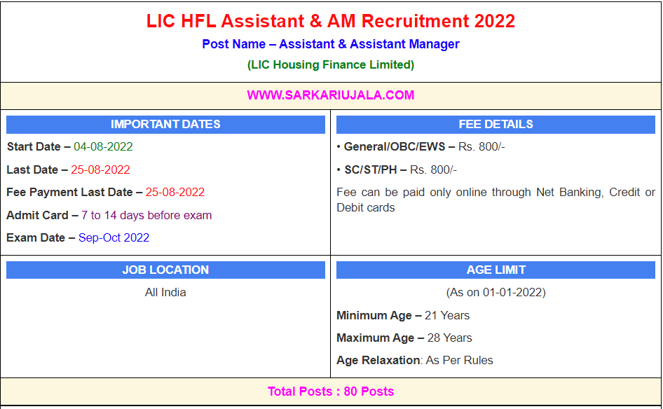 Post Description – LIC Housing Finance Limited is inviting online applications for Assistant & Assistant Manager for 80 posts. Interested people meet all the eligibility criteria, apply online Details Of Recruitment Of LIC HFL Assistant & AM Online Form 2022Posts Name – Assistant & Assistant Manager Number Of Posts – 80 Posts Category Wise Posts – Assistant – 50 Posts Assistant Manager – 30 Posts Pay Scale – Assistant – Rs.22730 – 52475/- Assistant Manager – Rs.53620 – 101040/- Education Qualification – Assistant – Bachelor Degree With 55% Marks Assistant Manager – Bachelor Degree With 60% Marks OR Master Degree How to Apply Online LIC HFL Assistant & AM Online Form 2022 – Candidates can apply through link provided below or they can also apply through official site of the LIC Housing Finance Limited before 25/Aug/2022.. Required Documents For Online Application – Educational Mark sheet And Certificates Aadhar Card / Pan Card Passport Size Photo Signature Selection Mode – CBT Examination Interview Final Merit List